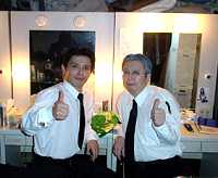 スカパン役で髪を白く染めている私(右)と、ウォン・ビンにちょっと似ている瀧川英次/スフィアメックス楽屋にて