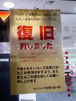 冠水した駅近くの店はこういう看板を出しているところが多い/しかし、みんな相当の被害額になったろうなぁ
