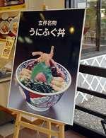 川登SAにあった「玄海名物・うにふぐ丼」の看板/ほんとかよ!って感じで、なんかインチキ臭いと思ったのは私だけでしょうか……第一、こっちでは「ふぐ」じゃなくて「ふく」っていうんじゃないのかな? 値段は1.300円、もちろん食べてません!