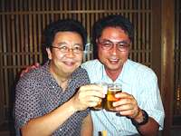 九州大学大学院の教授をしている小学校時代の友人・射場厚氏と、実に32年ぶりの再会の乾杯!/炊き餃子と竹豆腐がおいしい、平尾にある池田商店にて