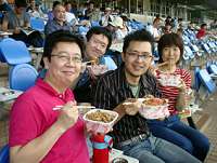今年の夏、最後のお楽しみ! 小倉競馬場で、牛丼弁当の特盛り(これしか売ってない)を食す、左から、私、春日先生、大野先生、黒岩先生の代アニ福岡校の講師4人!