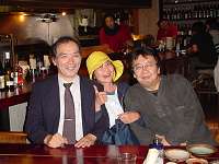 福岡演劇のひろばの薙野氏(左)、西鉄ホールプロデューサーの中村嬢(中央)と話が盛り上がり、いい気分で/博多餃子の店・游心にて
