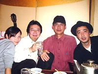 公演後、学生たちも一緒に飲みに行った(といっても、彼らは健全に、というか当然、アルコールは飲まなかった!)Moon Shan[ムーン・シャン]で、弥次さん役の寺っちゃんこと寺十吾(右端)と舞台監督の井村昂(その左)と、まだ弱冠17歳の学生の酒井香奈子(左端)と私/古い付き合いの井村氏は、知る人ぞ知る黒テント『キネマと怪人』のドラゴンその人!