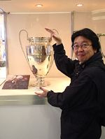 TNC会館で開かれていたレアルマドリード・ミュージアムでUEFAチャンピオンズリーグの優勝カップを手にしている(ように見える)私!/でも、サッカーにあまり興味のない私としては、その価値がわかりませんでした(すごいらしいけど)……その1