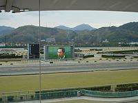 12レース終了後、小倉競馬場3階の指定席から見る、場内のターフビジョンに映し出された引退式で挨拶する岡部幸雄/1階の前の方に行って観ている人もいなかったし、ガラス張りの指定席にも人が少なくて、なんか寂しかった……ホントは「オカベ〜!」って叫びたかったけど……