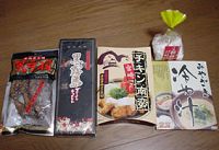 宮崎みやげの数々/左から、地鶏の手羽の日向[ひむか]炭火焼、芋焼酎・黒霧島のゼリーインチョコレート、甘酢タレとタルタルソース付のチキン南蛮、宮崎の郷土料理“冷や汁”、そして、その上が、熊本名産の朝鮮飴