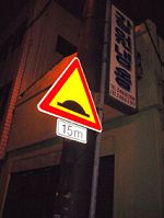 日本では見たことのない謎の交通標識! 一瞬、『星の王子様』の挿絵を思い出した! まぁ、ここから15m、道が凸してるってことなんだろうけど……/国際市場近くにて