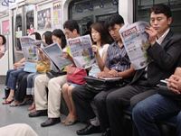 韓国では今、駅構内に置いてある無料の新聞が爆発的に流行っていて、地下鉄車内でも、みんなほとんど同じ新聞を読んでいる!/朝の地下鉄車内にて