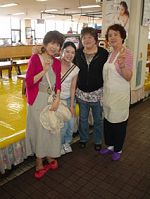 代アニ福岡校の、左からノベルズ科、声優科、コミック科の女性講師たちと食堂のアジュンマ(おばちゃん)[右端]との記念写真/おばちゃんがVサインしてるぅ!