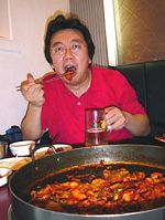 【バタバタ釜山・写真館】大きな鉄の鍋で炒められたタッカルビを、大きな口を開けて食す! 飲んでいるビールは大好きなHiteの生!/ユガネタッカルビ・西面店にて