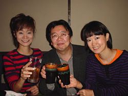 劇団きららの『INDEX.6th』を観た後、キャスト・スタッフ・関係者総勢40名ぐらいの飲み会の席で、きららの主宰者で、作・演出・役者をこなす池田美樹嬢(左)と、演じるキャラクターがどれもみな魅力的な、役者の宗真樹子嬢(右)と乾杯!/上川端・焼鳥居酒屋しんちゃんにて