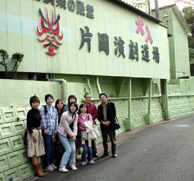 片岡演劇道場の前で、みんなで記念写真!/ここもまた、住宅街の中に忽然と現れる不思議な空間[劇場]! ぜひまた行ってみたい!