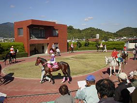晴天に恵まれた佐賀競馬場のパドック[馬の下見所]/山に囲まれていて、小さくてのんびりしてて気持ちいい! 茶色の建物の上の方にある馬の枠順の案内板は手書き! 1レース毎に裏返して書く!