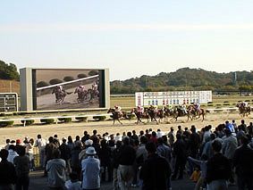メインレースのスタンド前の馬場/一応、大きなモニター(バッカルビジョンというらしい)はある! 当然のことながら、周りは山! コースはダートだけ!