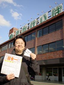 お約束通り、メインスタンドをバックに当たり馬券を持って記念写真!/「日本一」という名前が目立つ佐賀競馬の予想紙は520円だった! 有限会社競馬日本一の発行!