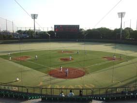 藤沢総合対弥栄東・西合同チーム対戦中の引地台球場グラウンド/人工芝でナイター設備もあり、プロ野球の試合も行われたことがある立派な球場!