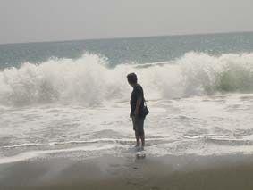 台風が接近していることもあるのか、時々やってくる大きな波の前に立っている私/この後、当然、大変なことになった! でも、海は楽しい!