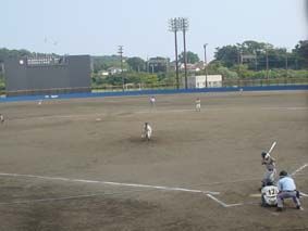 平塚学園湘南研修センターのグラウンドでの藤沢総合対深沢戦、藤沢総合最終回の守り! ピッチャーは熊谷君/結局、3人でゲームセット! 藤沢総合が3対1で勝利、3回戦進出!