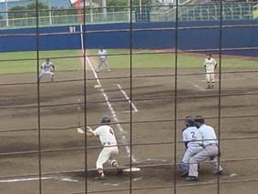 藤沢総合高校対平塚学園戦・5回表1アウト後の次男の打席/2球目のストレート、うまく打ち返して右中間を抜け、結局3塁打に! これが、その後の先制点に結びつく!
