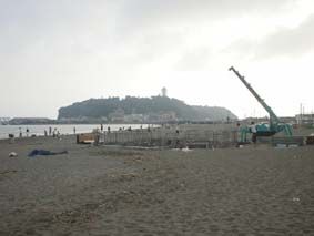 次々と海の家が壊されていく東浜海岸から江の島を望む!/考えたら、広い砂浜を多くの海の家が占拠するから、砂浜が狭くなって混雑するんだ! 自然のままが一番いいと思うけどなぁ……