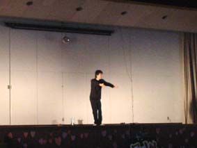 広い体育館のステージで繰り広げられる長男の一人芝居・その1/ステージの前は広々空いていて、はるか彼方でやっている不思議な感じの舞台!