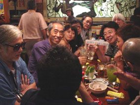 『寺山修司−過激なる疾走−』観劇後の“呑者家・銅鑼”での飲み会/一番左が、年を取ってもカッコいいJ・A・シーザー、隣りでこちらを向いているのが吉田光彦さん、一人おいて榎本了壱さん、高取英さん、私がいて、奥の白髪の方が映画評論家の松島利行さん、右の二人が市川正さん御夫妻
