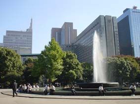 日比谷公園の噴水から帝国ホテルを望む/お弁当を食べている人がいたり、散歩やジョギングをしている人がいたり、ニューヨークにおけるセントラルパークのような、都会の中のオアシスだ