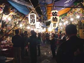 どれくらい出ているのかわからないが、すごい数の熊手の露店があり、軒先に屋号の提灯が飾られている/左の店では、客が大きな熊手を買ったので三本締めをやっている