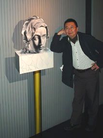 トリックアート美術館の絵Aこれも首の彫像の置かれた台に、私が肘を置いているように見えるが、実際は壁に描かれた絵/影のところも、それらしく描かれているだけ