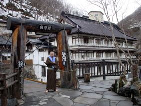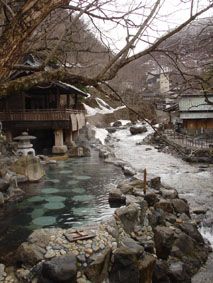 宿から、前を流れている川にかかった吊り橋を渡って露天風呂へ行く/右に見えるのが、まるで『千と千尋の神隠し』に出てくる油屋のような汪泉閣の建物の一部