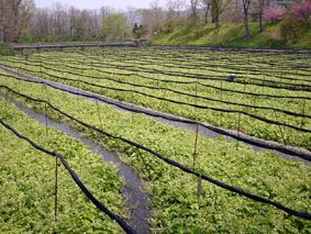 安曇野のきれいな水が流れている、大王わさび農場の広大なわさび田の一部/とにかく広く、わさびの成長具合によっていろいろなわさび田があり、その成長過程を見ることが出来る