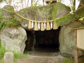 大王わさび農場にあった、古墳時代、全国統一を目指す大和朝廷に対し、住民たちのために立ち向かった魏石鬼八面大王が最後に立て篭もったというほこら/私の作品『飛行少年・夢の乙丸』に出てくる石倉そっくりだ! 「石倉が、飛ぶ!」