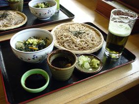 農場内にあるそば処で食べた、わさび菜丼と信州そばのセットとわさびビール/穫りたての生わさびと共にわさび尽くしでツーンとスッキリ!