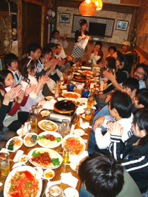 日を改めての打ち上げ! 新大久保の韓国料理屋「韓サラン」で30人がすし詰め状態で大入り袋配りの儀式/例によって、次の人を紹介して渡していくという月光舎方式で盛り上がった!