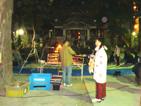 夜行館の公演の舞台である香取神社の本殿の前に、役者たちの名前が書かれた幟があり、ここをくぐって中に入る/アングラな名前と幟はマッチしている