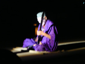 スコップ三味線で演奏(スコップを栓抜きで叩いて音を出す)しながら歌を歌う、実際に住職だという白澤運山/このスコップ三味線というのは青森では有名で、大会もあるらしい