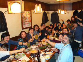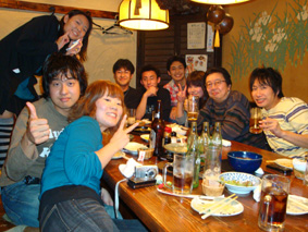 韓国・春川の劇団DOMOの打ち上げ/熊谷さんが日本のいろいろな種類のチューハイを韓国の人たちに説明しているのがおもしろかった! チョン・ウソンにそっくりなイケメンの役者(今回はスタッフだとかで出ていなかった)がいた(左端の方に写っている)