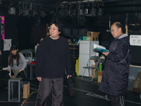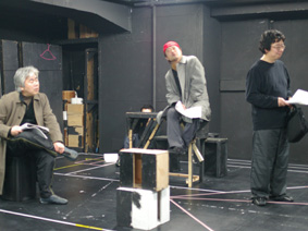 2月の最初の頃に撮った龍昇企画の稽古場写真1/まだ台本を持った半立ち状態の、左から、龍昇、栗原茂、私