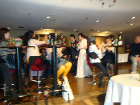 大鷹明良・小林あやの結婚披露パーティー1/新郎新婦は3階のバルコニーから降りて来て、客席の中を通ってステージへ向かう
