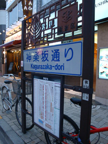 昔はなかった、神楽坂の途中の何ヶ所かにある看板/下に通り沿いの店の紹介も書いてあって便利