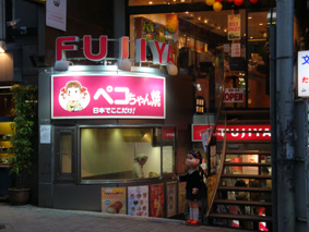 神楽坂名物のひとつになった"ペコちゃん焼"のある、飯田橋寄りの坂の下の方にある不二家/「日本でここだけ!」なので、おみやげにすると喜ばれる