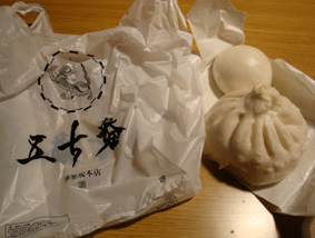 蒸かしたてのを買って来て楽屋で食べた、五十番の肉まん(360円)とミニあんまん(180円)/別の日には毘沙門天の境内で立ち食いをした! 普通の肉まんひとつでも、結構お腹がいっぱいになる