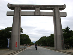 筥崎宮の参道の入口にある大鳥居! 下にいるのが私/海の近くで、海に向かってあり(手前が海側)、このずーっと奥に筥崎宮がある