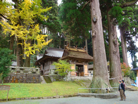 樹齢700年以上という夫婦杉(右の太い2本)がある小国町の鉾納宮[ほこのみや]/森閑としていて悠久の時間の流れを感じ、厳粛な気持ちになる