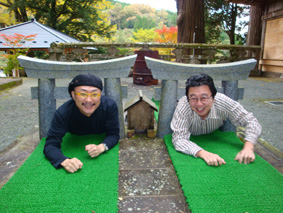 下をくぐると願いが叶うというミニ鳥居を、苦労しながらくぐる私と、楽にくぐるハンキンさん/筥崎宮の大鳥居と比べてみて!