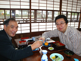 風情のある川沿いの2階の座敷で薙野さんと熱燗で乾杯!/有名人も結構来ている