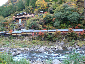 渓流沿いの山の斜面にある観音岩温泉/26種類の風呂が長く連なっている