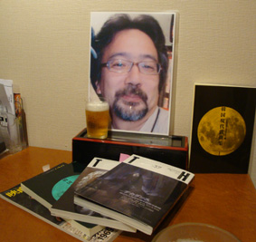 13日(土)の夜、クマさんも好きだった福岡の「ふとっぱら」で、福岡の友人たちと追悼会を開いた/クマさんの翻訳した戯曲が載っている韓国現代戯曲集のTとUと、最近書いた原稿が載っている『映画芸術』の4月号と『TH』の37、38号を前に、にやけた顔のクマさんの遺影 ※なぜ、にやけているかというと、右隣にクマさんの好きな韓国の女優さんがいたから……