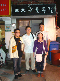 成均館大学のすぐ前にあるパク・クニョンの劇団コルモッキルの稽古場(地下にある)の建物の前で/左から青木さん、私、かんのに中村さん