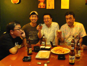 スヒはドラマの撮影でいなかったが、スヒの婚約者チョン・ヨンホ氏(左から2番目)と乾杯!/一番左の青木さんは電話の最中